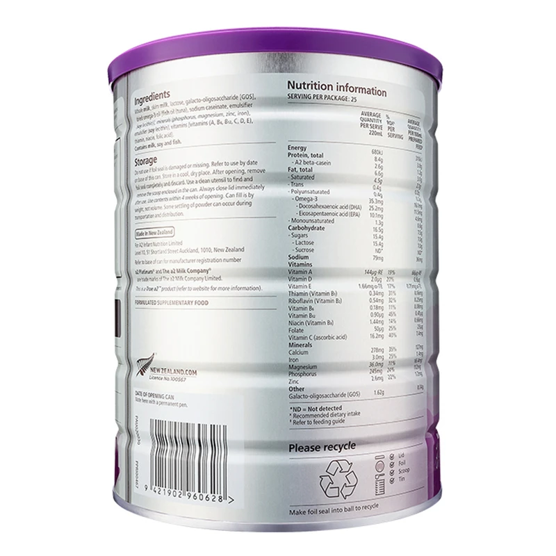 Whole milk, skim milk, lactose, galacto-oligosaccharide[GOS], dried omega-3 oils [fish oil (tuna), sodium caseinate, emulsifier (soy lecithin)], minerals (phosphorus, magnesium, iron, zinc) emulsifier(soy lecithin), vitamins [vitamins (A, B6,B12,C,D,E), thiamin, niacin, folic, acid], Contains milk, soy and fish.