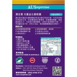 AUSupreme Kids Probiotic Gummy contains 2 billion CFU probiotics (Bacillus coagulans) per serving. It helps to make sure that your children’s intestinal tract stays healthy by maintaining a balanced level of good bacteria in the intestines, and play a vital role in supporting a healthy digestive system and good immunity.