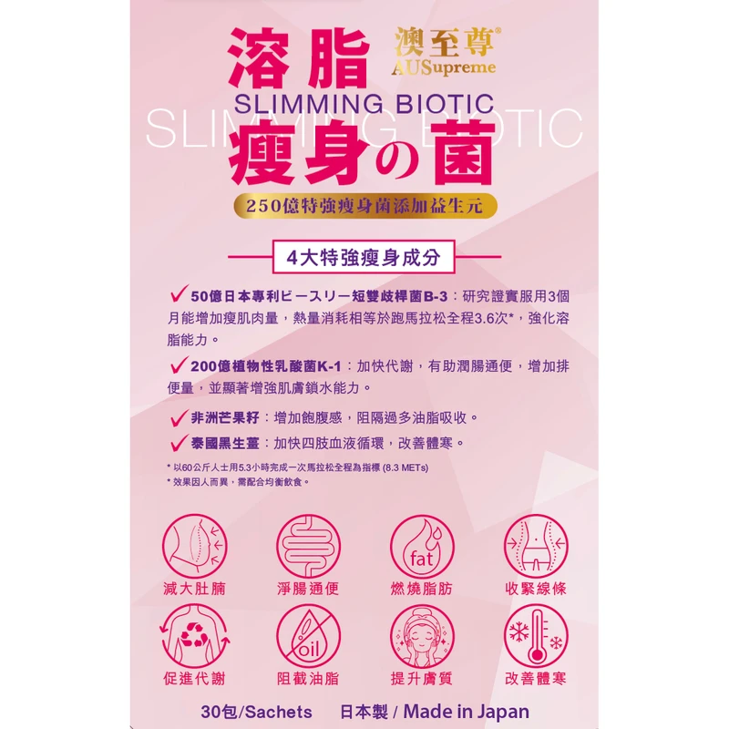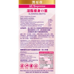 AUSupreme Slimming Biotic uses Japanese patented probiotics to support weight loss. Each pack provides 25 billion extra strength slimming bacteria (B-3 probiotics and K-1 plant-based lactic acid bacteria), matches with high-quality prebiotics (Inulin and Indigestible Dextrin), which provides sufficient nutrition for the survival and reproduction of beneficial intestinal bacteria.