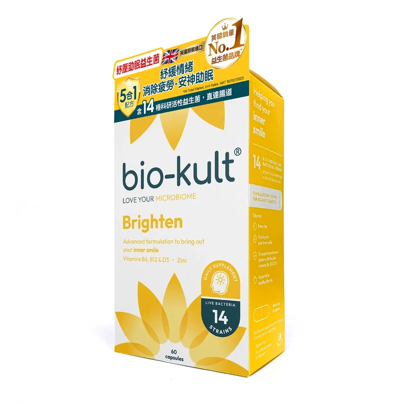 Bio-Kult brighten probiotics, scientifically developed 5 in 1 formula, to target your digestive system and emotion regulation. An advanced multi-action formulation contains 14 strains of live bacteria,vitamin B6, B12, D3 and zinc, designed to bring out your Inner Smile.