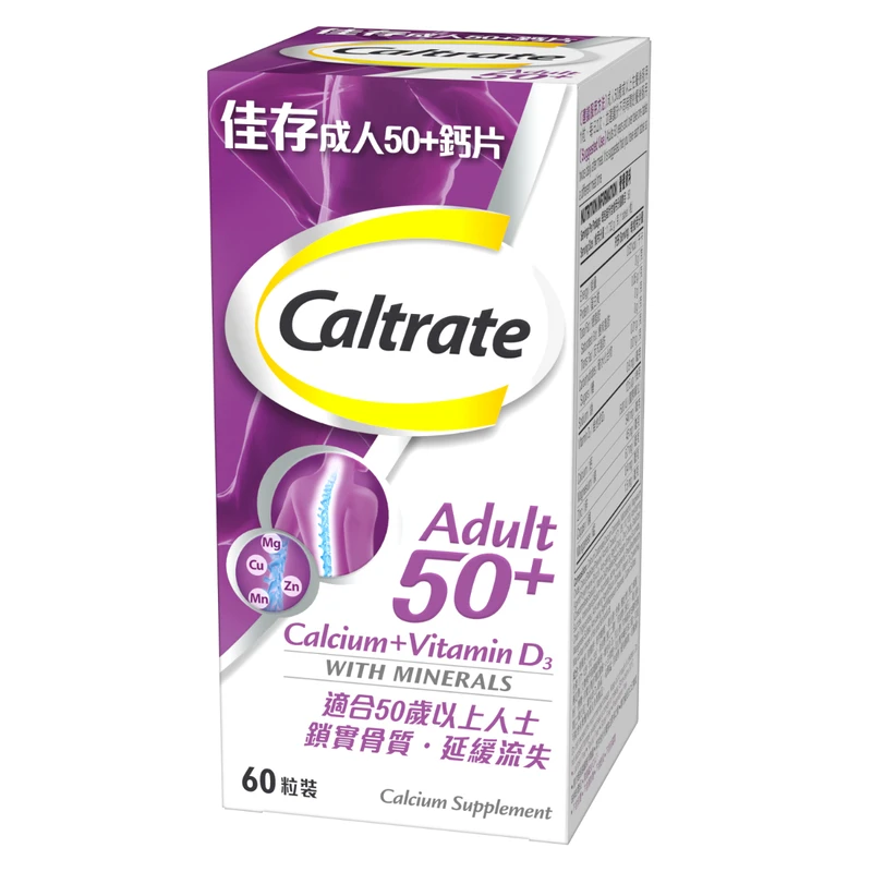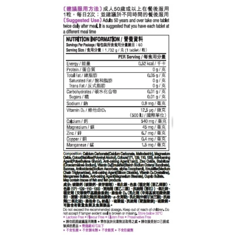 Suitable for Aged over 50+. Provides Calcium, Vitamin D, and 4 added minerals: Mg, Zn, Cu, and Mn, which help reduce bone loss and maintain bone health.