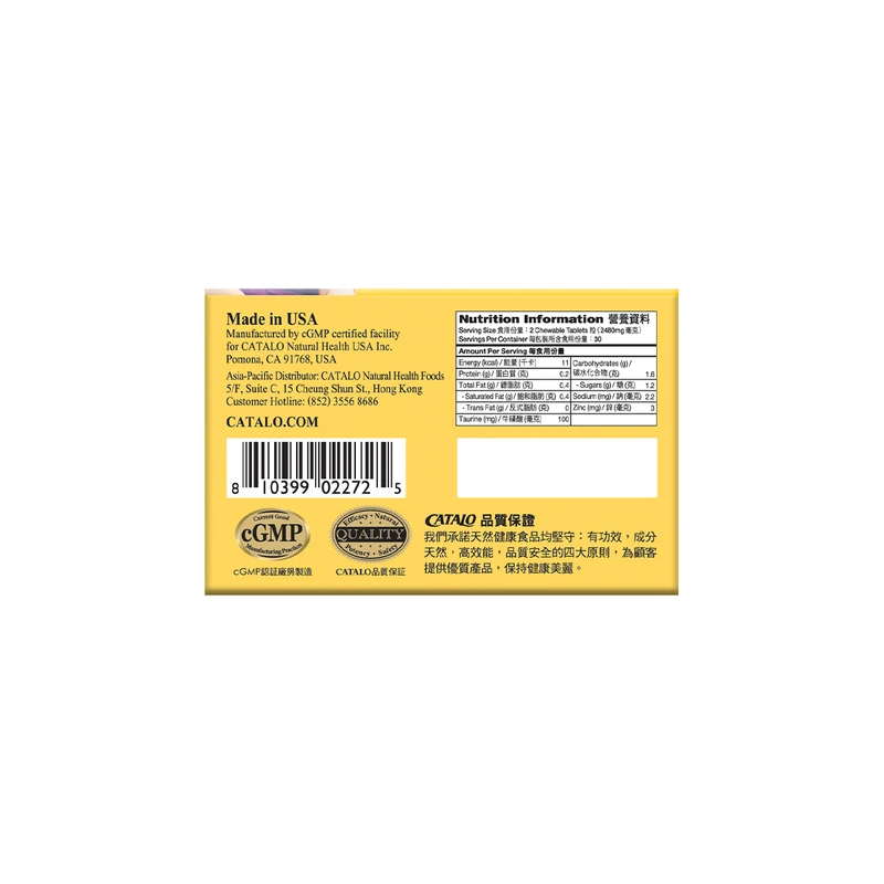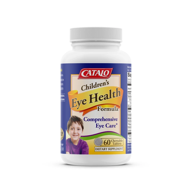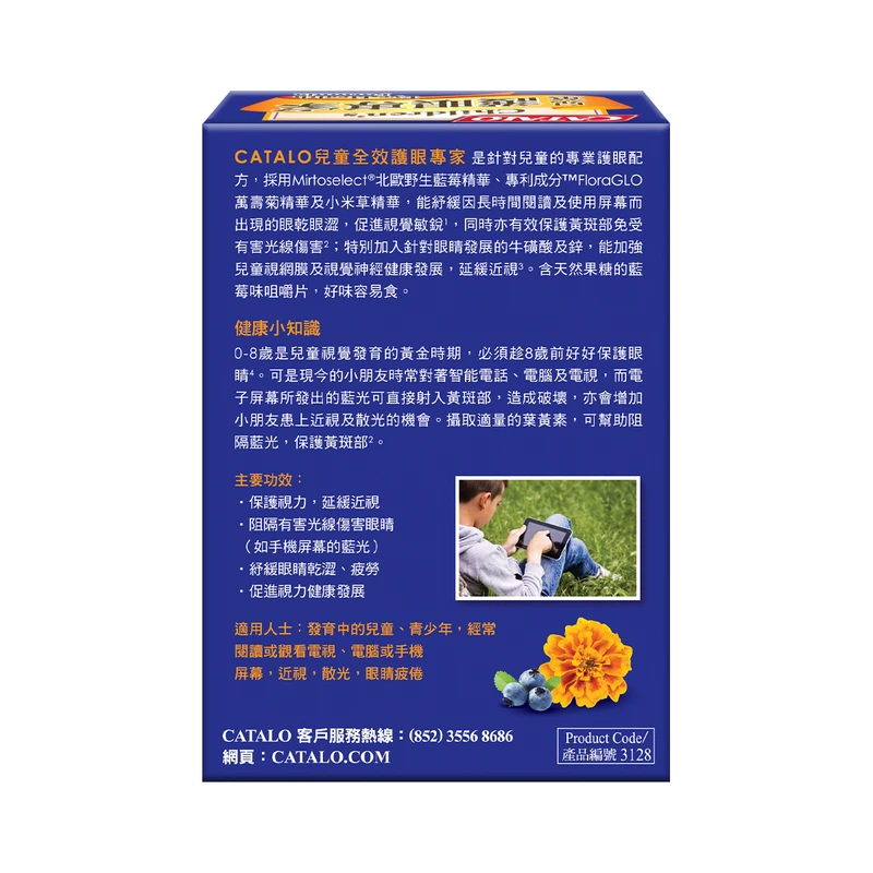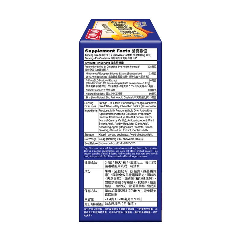 CATALO Children’s Eye Health Formula is specially formulated to protect the health of the eye for children. It contains Mirtoselect® European Bilberry Extract, US patented ingredient ™FloraGLO Marigold Extract, Natural Eyebright Extract and Natural Lycopene, it is clinically proven to relieve eye fatigue and improve vision and filter harmful light (including blue light from digital screen). It is specially formulated with Taurine and Zinc to strengthen healthy retina and neural development and alleviate myopia. With natural fructose and blueberry vanilla flavour, the chewable tablet is delicious and easy to chew.