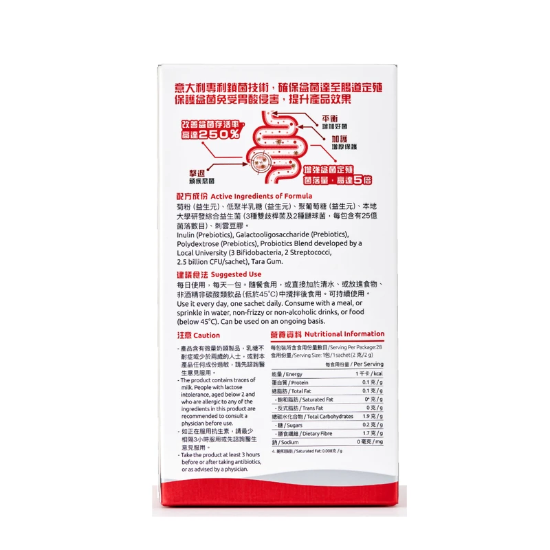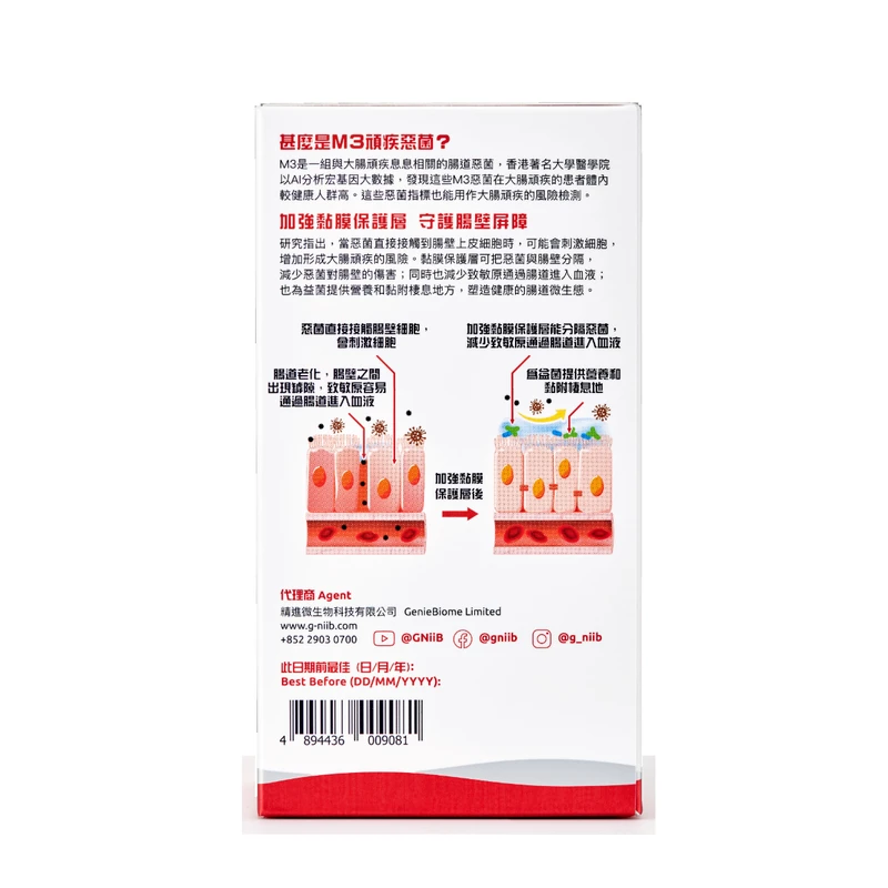 G-NiiB M3XTRA is a microbiome gut protective formula developed by the Centre for Gut Microbiota Research, a local university. It is tailored for Asian unique intestinal environment. The product with 3 patents is rich in 5 natural probiotics and 3 prebiotics. It effectively restores the gut microbiome’s equilibrium, guards the gut against serious illness-inducing bacteria, and enhances gut protection.
