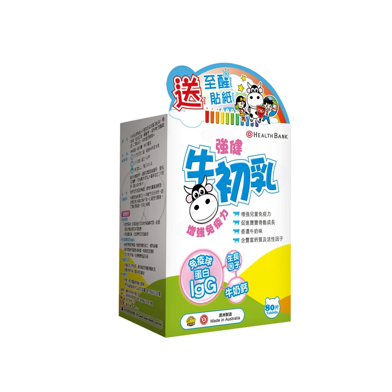 Cow’s colostrum is a form of milk produced by the mammary glands of cows 48 hours after giving birth. It is rich in high quality protein, immune cells and growth factors. Elements such as immunoglobulins, lactoferrin and growth factors in cow’s colostrum could boost immunity in children and promote gut health. HealthBank Colostrum is selected from cow colostrum using cows from Australian pastures and is produced by using a low temperature spray drying technique, under the strict control of TGA ‘Good Manufacturing Practices’. Cow’s calcium has been specially added to each piece of HealthBank Colostrum to promote the growth of healthy bones and teeth so that children can have a strong physical fitness.