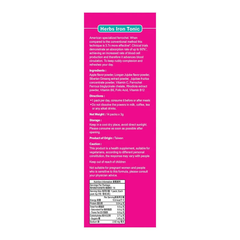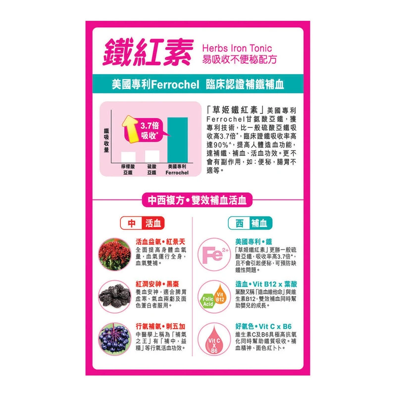 Herbs Iron Tonic ingredients : American specialized Ferrochel. When compared to the conventional method this technique is 3.7x more effective*.