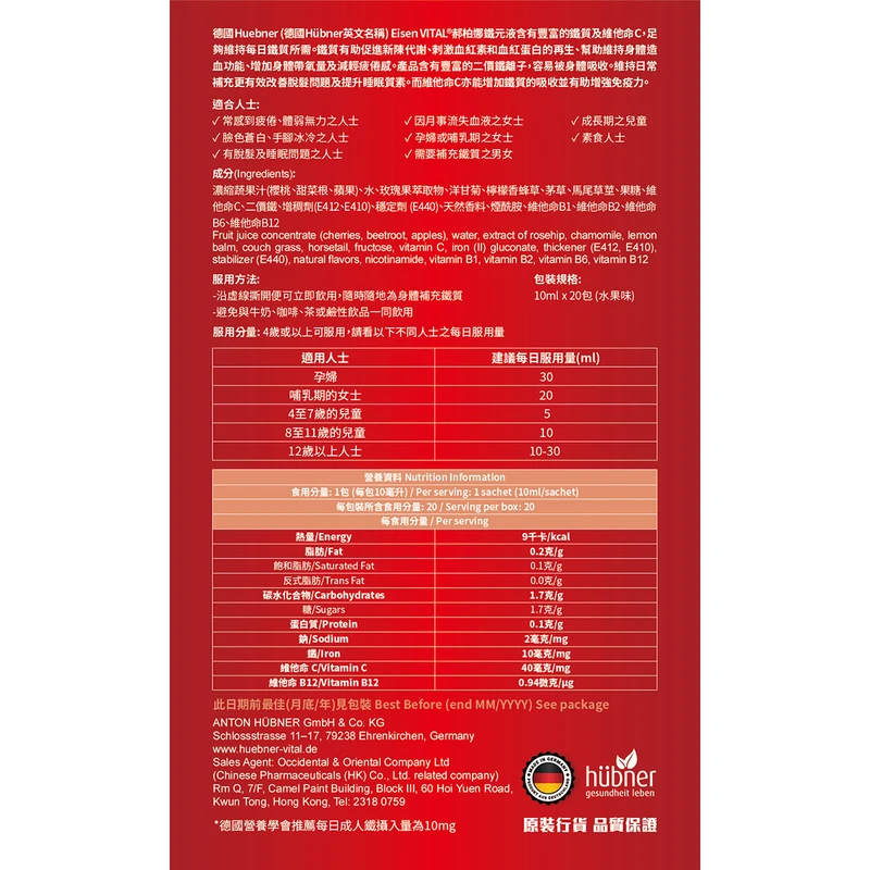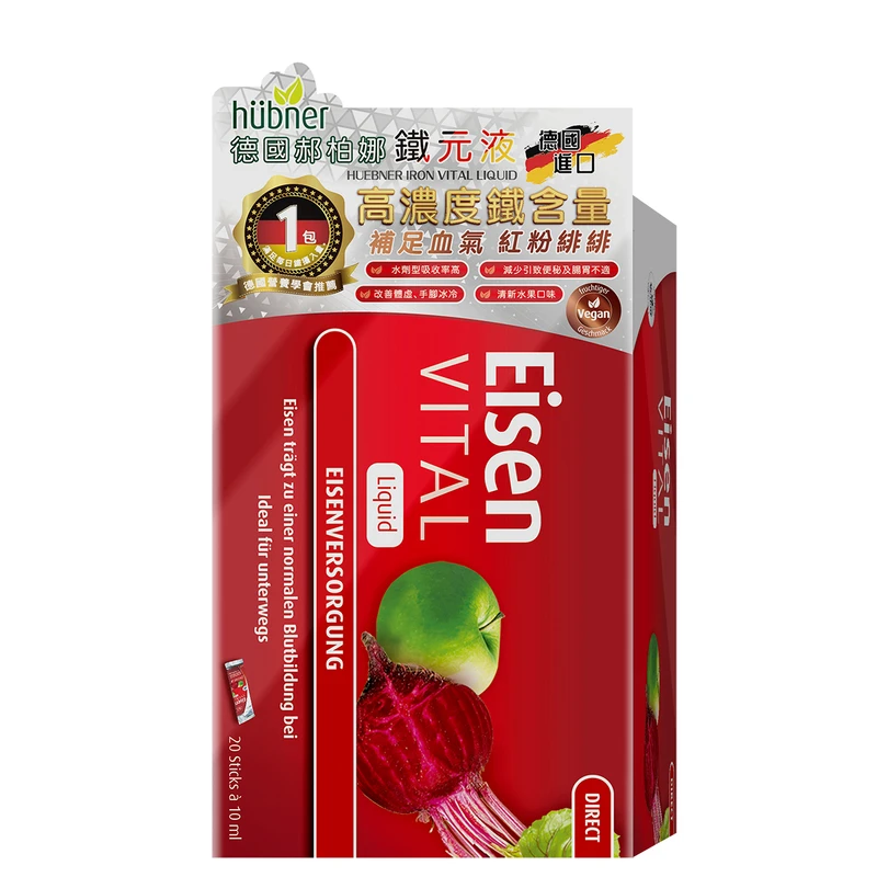 Hubner is a long-established German health care brand with natural and high quality products, growing in the German and international markets with its tradition and innovative product development. Haberna Iron Liquid is a nutritional supplement specially designed for modern urbanites, targeting people with weakness due to iron deficiency. The product contains rich and easily absorbed bivalent iron ions, and also adds vitamin C and B complex to help iron absorption and provide different nutrients. With a variety of fruit and vegetable extracts, natural ingredients, sweet and sour taste. It is suitable for people who are often tired, pale, suffer from anemia or need a large amount of iron supplementation, as well as for pregnant or lactating women and growing children.