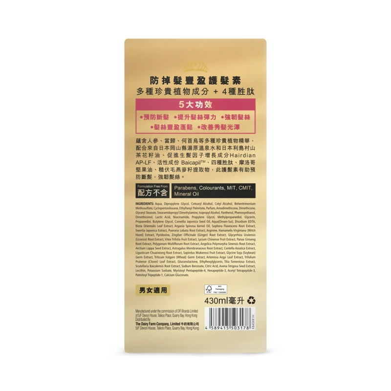 Containing a variety of precious plant extracts such as ginseng, angelica, and He Shou bird, together with Yuhara hot spring water from Okayama Prefecture, Japan, and camellia seed oil from Lidaomura, Japan, Hairdian AP-LF, a hair growth ingredient, Baicapilâ„¢, and four peptides, this hair growth essence helps prevent hair loss and promote hair growth, with a light texture, non-greasy, and fast absorption.