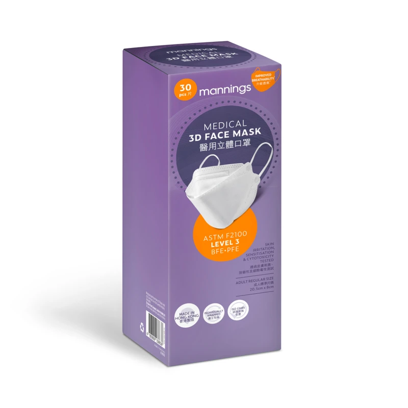 Mannings 3 Ply Medical 3D Face Mask (Individually Wrapped) – White 30pcs (20.5cm X 8cm)