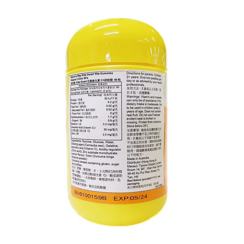 Sucrose, Glucose, Water, Glazing agent (Carnauba wax), Gelatine, Ascorbic acid (Vitamin C), Acidity regulator(Citric acid), Zinc sulphate monohydrate, Lemon flavour, Color (Curcuma longa rhizome powder)