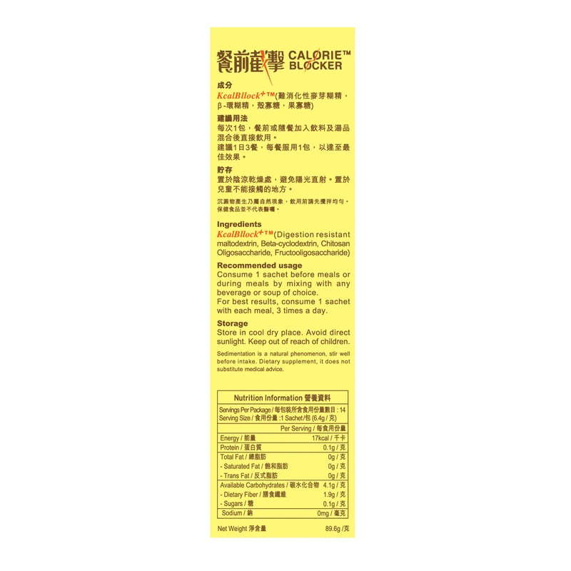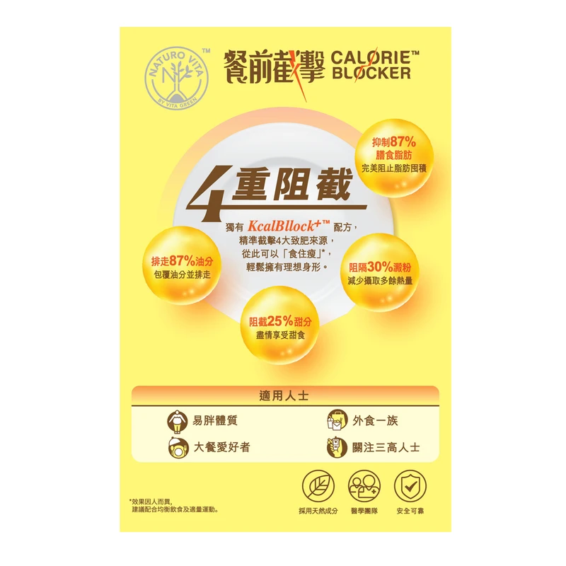 Containg Kcalbllock+â„¢ a formula designed to effectively restrict the digestion of these four key calorie sources, this product can help inhibit the absorption of fat-inducing foods.