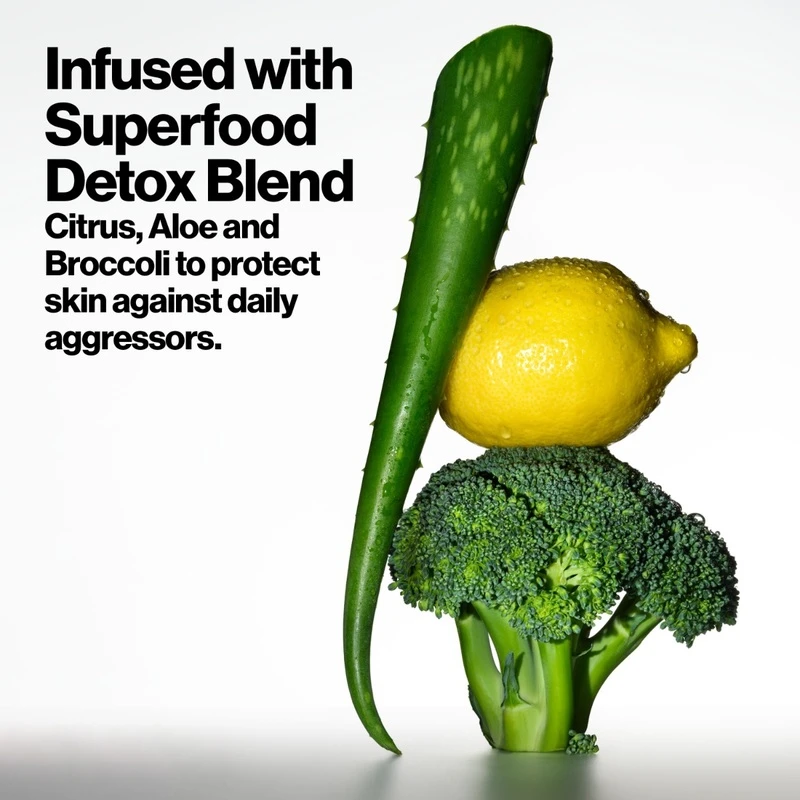 It is also formulated with a Superfood Detox Blend (citrus, aloe and broccoli extracts) which protects skin against daily pollutants.