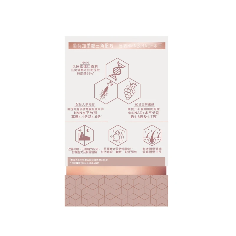 Royal Medic NMN Prime 21000 contains NMN raw material imported from Japan. NMN is extracted by advanced enzymatic technology, and has been certified by designed parties of Ministry of Health, Labour and Welfare, with a purity of 99%. NMN combined with ginsenosides and resveratrol can effectively increase the level of NMN and NAD+ in the body.
