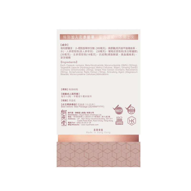 Beta-Nicotinamide Mononucleotide (NMN) (350mg), Vegetable capsule (Hydroxypropyl Methyl Cellulose, Water), Ginseng Extract (Contains Ginsenosides) (35mg), Grape Peel Extract (Contains Resveratrol) (35mg), Scrophularia Radix Extract (18mg), Anticaking Agent (Magnesium Stearate, Microcrystalline Cellulose), Maltodextrin