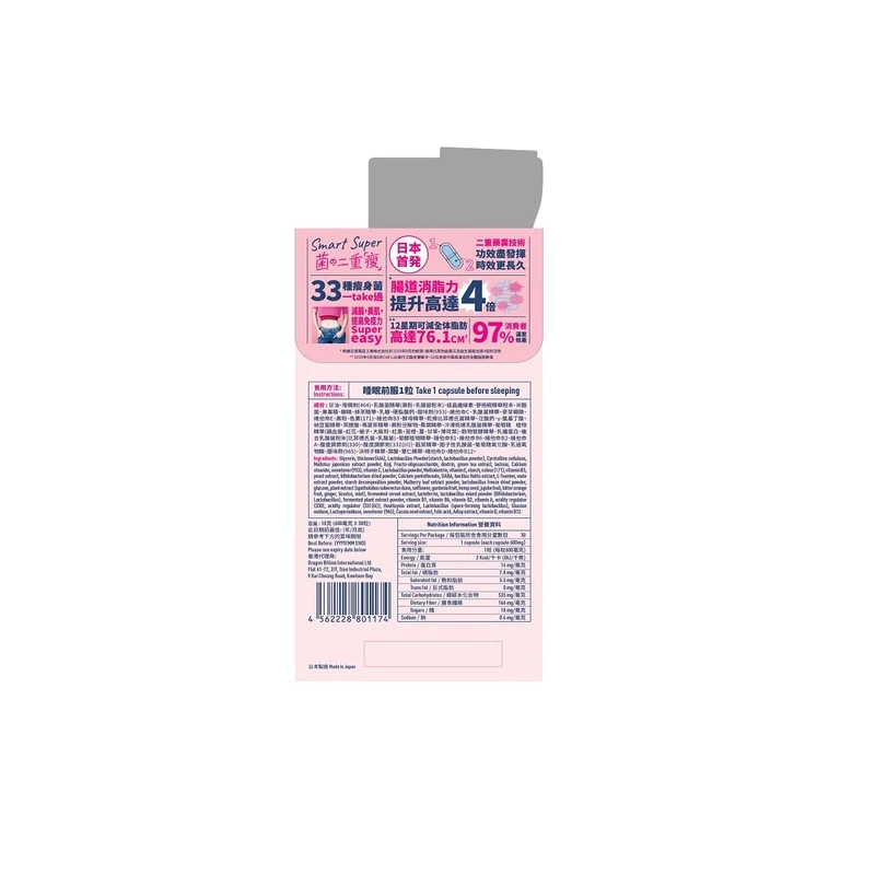 The first slimming product to utilize the Duocap capsule-in-capsule technology, boosting product effectiveness by 400% and ensuring slimming bacteria and probiotics are safely delivered to the intestine.