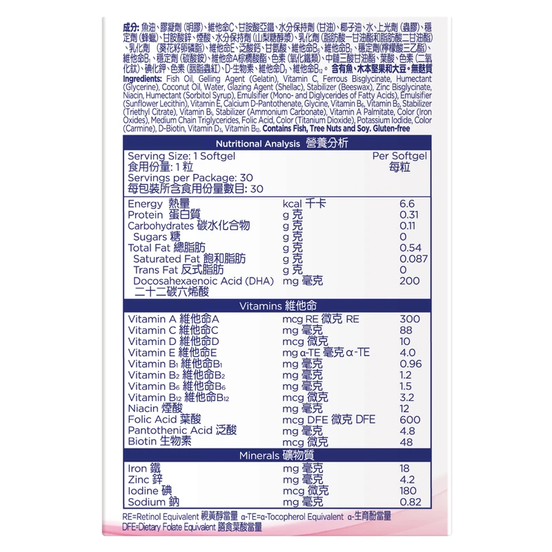 Simple and convenient with one capsule per day to supplement 15 kinds of vitamins and minerals and 200 mg of DHA, providing the key nutrients for pregnant and lactating women.